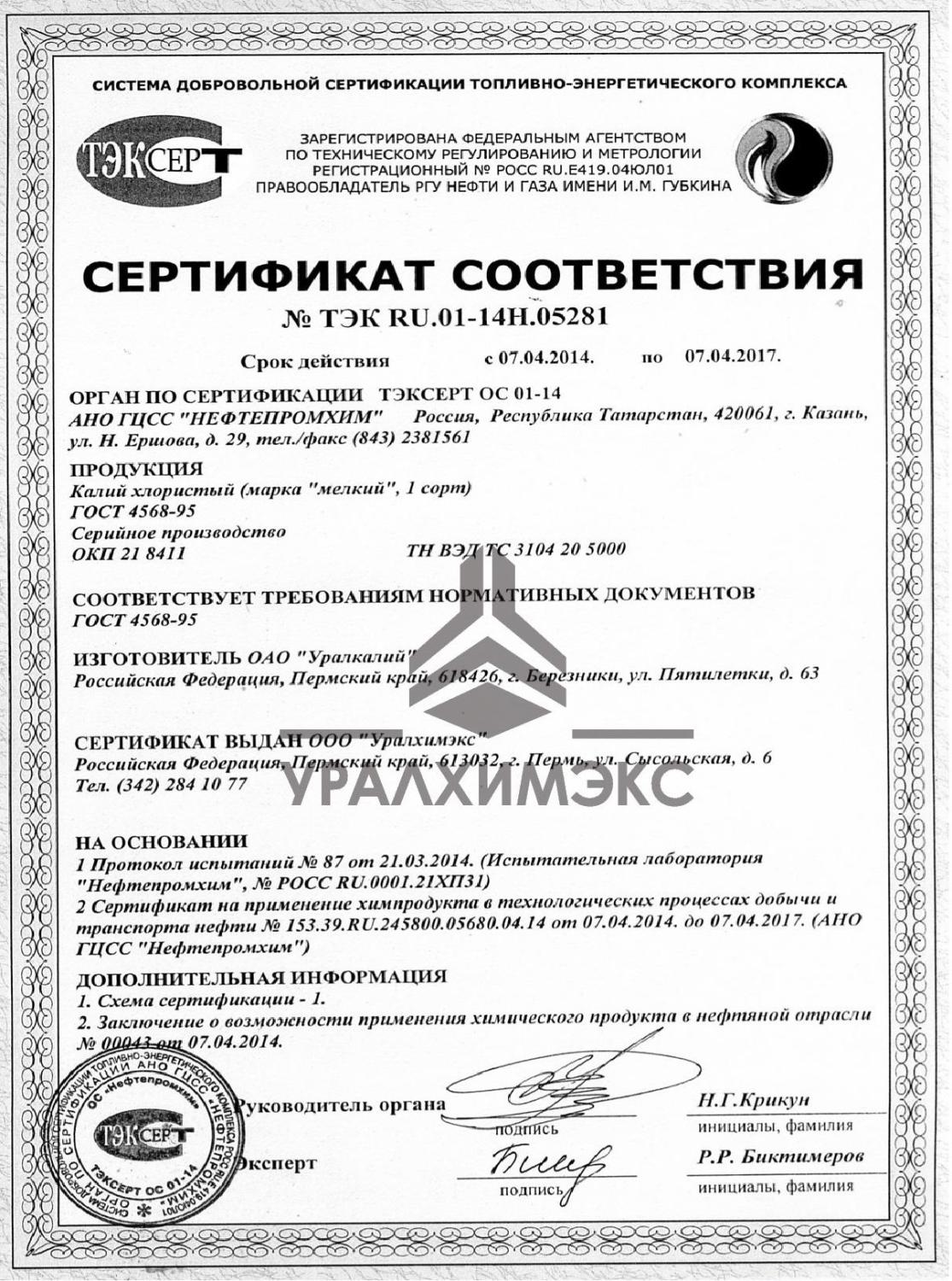 Сертификат соответствия калий хлористый ТЭКСЕРТ