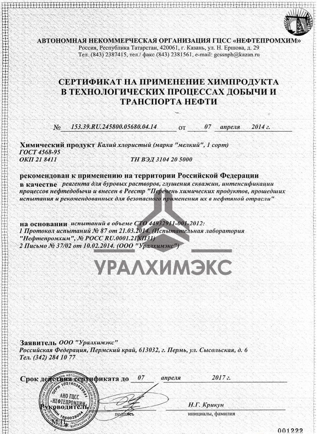 Сертификат на применение калия хлористого в технологических процессах добычи и транспорта нефти